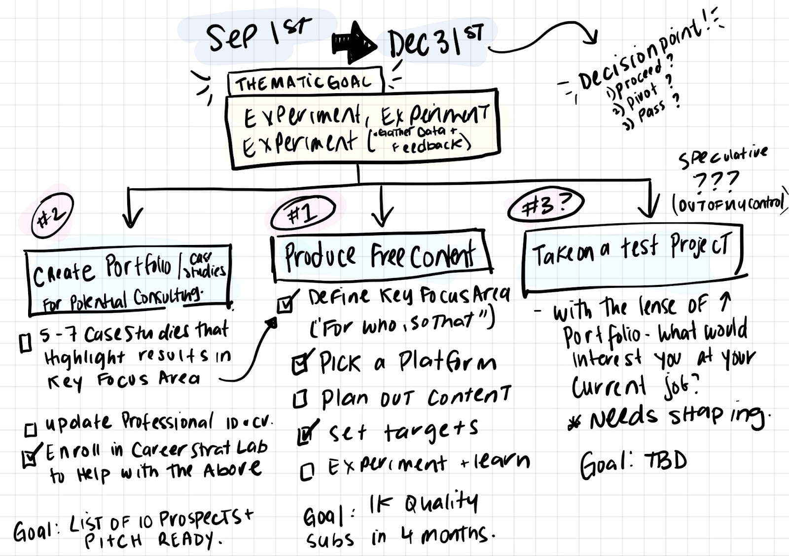 Priority #3 is to take on a project in my current company and treat it like a consulting project. This will allow me to test my theory and add a most recent case study. This one is outside my control because I need to get CEO approval. I also don’t know what it could be yet. I’m still in the research phase.